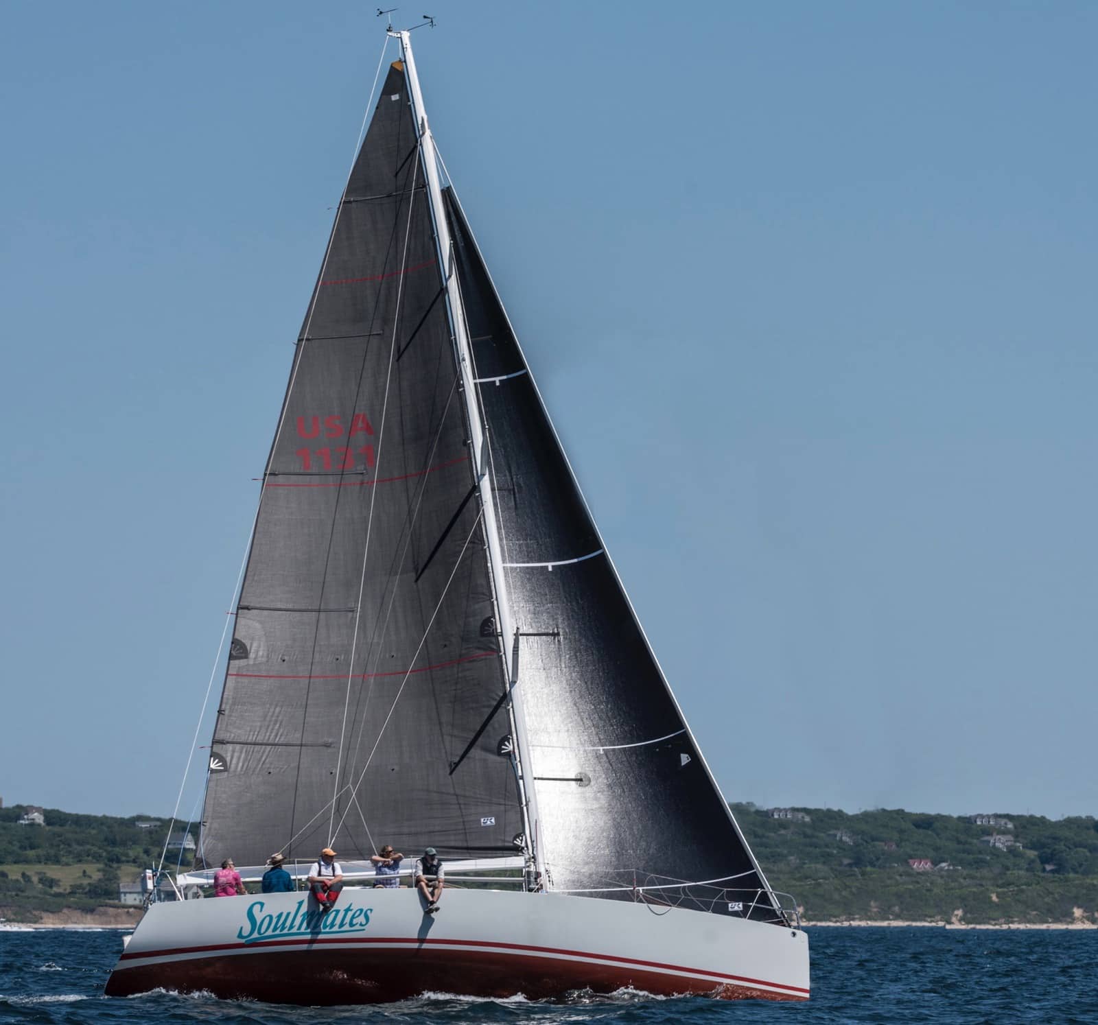 SOULMATES was built in 1991 by Goetz Custom Sailboats and originally named KATIE G, after Eric Goetz’s then three-year-old daughter. Goetz had Rodger Martin design his boat to be a doublehanded ocean racer and fast cruising boat. Her design date is apparent in the fractional rig, with four sets of in-line spreaders and running back stays that hold up the towering carbon rig (see image of the sail plan).