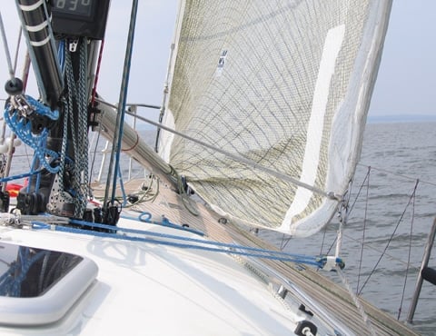 For an inhauler system to work, the jib clew must be at cabin height. If there’s a lot of leech return (when the exit of the sail turns in towards the centerline), inhauling will create excess drag and slow the boat. Remember that the greater the return on the leech, the more it works like an airplane’s flaps during landing—drag causes the airflow to really slow down, and in turn, backwind the main.