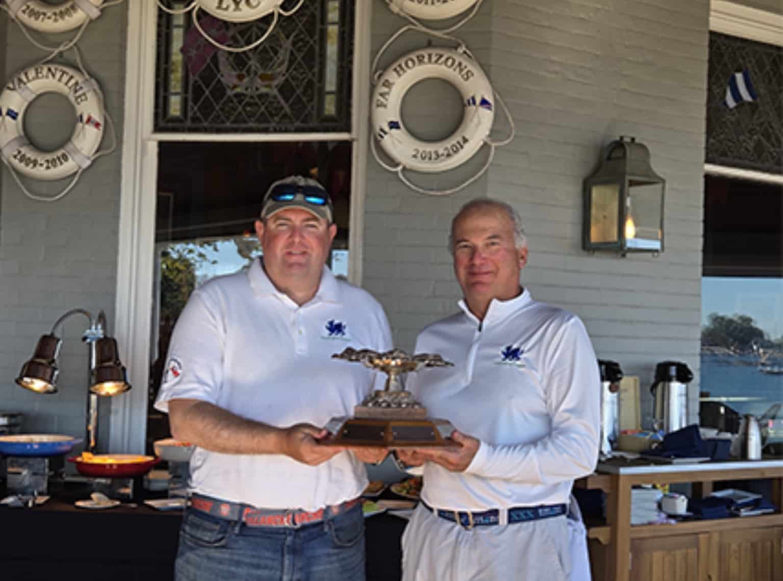 Weiss summed-up the race, “This was an interesting double-hander on a boat with no autopilot. At times, we put the tiller extension on the gear shifter to steer while we handled the boat and sails. The key to our success was staying to the south on the leg to Eaton’s. Us getting the new breeze first pushed us ahead of the fleet…all of which were bigger boats. The second leg to Cows was straight forward, but our playing the shore back to Larchmont from Stamford protected our lead. There was some good competition out there in these flukey conditions. Also, as a Flag Officer of both of the host Clubs, I was very pleased to have won this new race’s second running. I’m also glad that we had really nice sailing conditions and that the ‘bitter’ aspect of the Bitter Ender didn’t materialize.”
