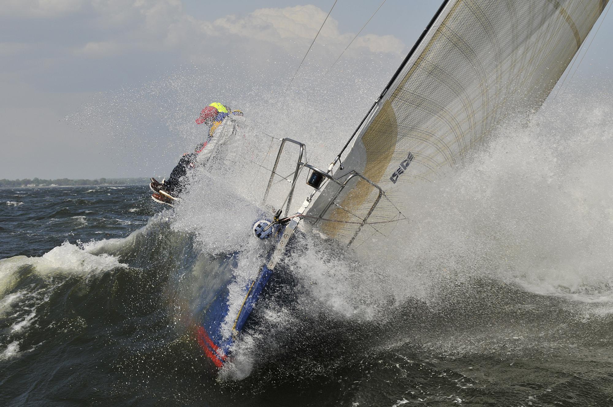 After a well-designed sail leaves the loft, sailors tweak it on the water; remember your primary controls are: sheeting angle, area, and the amount of apparent wind you coax into the balanced equation. It’s at this point when sailing in heavy weather that we should sheet a little harder, or close sail-twist a smidge to keep the hull just short of being over-powered. Bear in mind that ALL Tips above must be satisfied before applying this final touch of power. Basically, this extra edge applies what’s needed to overcome wave resistance – ease any excess power quickly if it suddenly becomes too much.