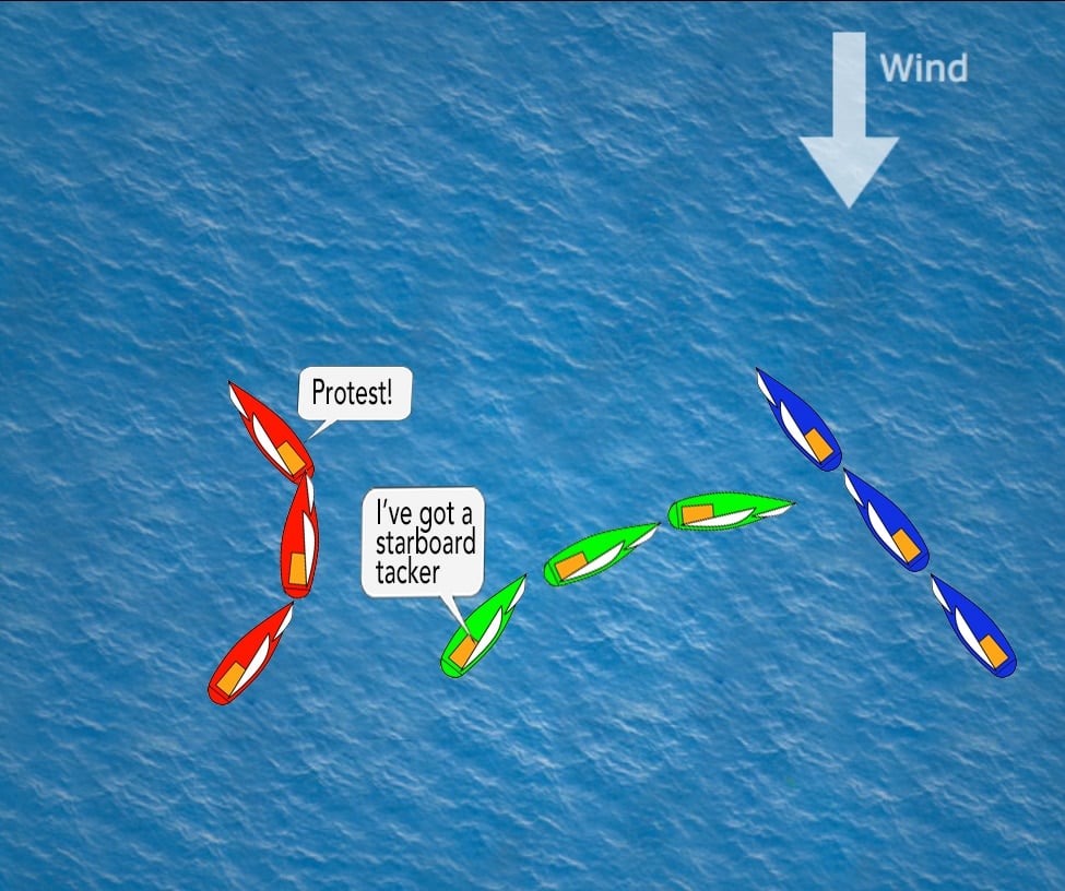The boat that tacked calls protest and displays her protest flag in belief that the leeward boat had broken rule 20.2 (d): When a hailed boat responds, the hailing boat shall tack as soon as possible.