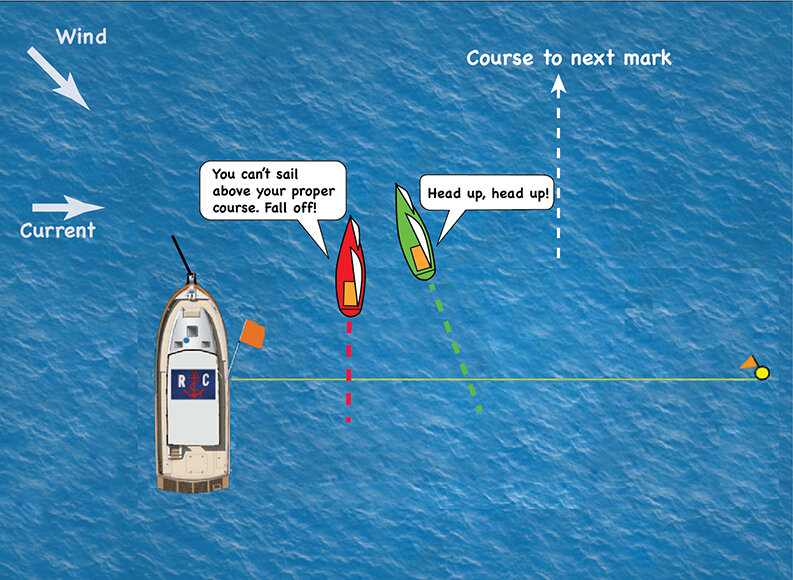 In this example, if Red was not there, Green would sail higher so that the current would not push her below the mark. Therefore, that is her proper course. The rule makers purposely made the term “proper course” subjective since racers have different ideas on how to sail the course as fast as possible. Green could even justify sailing higher because she saw more wind to windward.