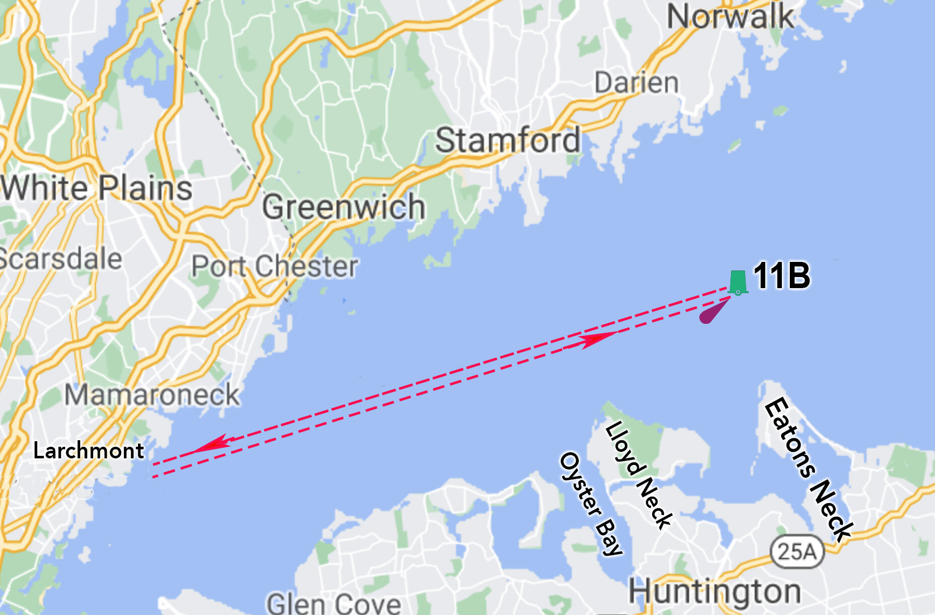 The course of the Edlu Race runs from Larchmont Harbor, almost straight down the middle of Long Island Sound to its single turning mark off Eatons Neck 16 miles to the east. The width of the sound gradually increases during this leg from about 3 miles at Larchmont to about 5 miles at Eatons. This gives teams plenty of options for which side of the course to sail.