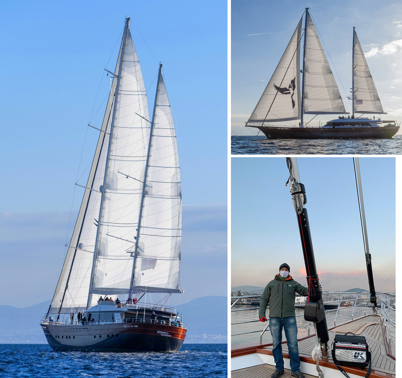 Outfitting a boat, no matter if it is a J/24 or a super yacht, is all about balancing priorities. The owner of this super yacht chose dacron for the massive sails on his 154-footer (47 Meters). Woven polyester, commonly know by DuPont’s trademark “Dacron,” is still the most used material for making sailboat sails. These photos were taken during VENTUS’s her maiden voyage with her new sails made by the UK Sailmakers loft in Marmaris, Turkey. These sails are enormous! The total sail area for the genoa, staysail, main and mizzen is 11,108 square feet. For reference, the schooner AMERICA’s upwind sail area was less than half that at 5,300 sq/ft and the J Boat RANGER’s upwind sail area was 7,546 sq/ft. VENTUS was built for luxury cruising with one big master cabin and four guest cabins. The 11-person crew share six crew cabins. Her hull is a wood/epoxy composite, which is a specialty of her Turkish super yacht builder Mengi Yay Yachts. The detail photo shows Baris Celik of UK Sailmakers Turkey standing next to the huge hydraulic furler for the 2,088 sq/ft staysail. The genoa is a massive 3886 sq/ft. While most owners would choose a lighter and less stretchy material to make sails for their super yacht, remember the saying of, “He who writes the checks calls the shots.”